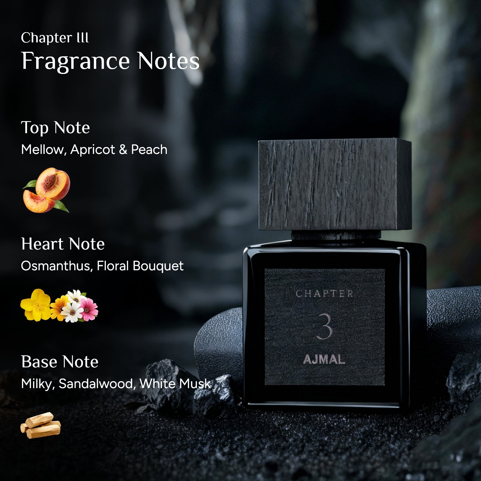 Red Fruits, Apricot, Peach, Osmanthus Flower, Rose Absolute, Sandalwood, Amber, Musk.
