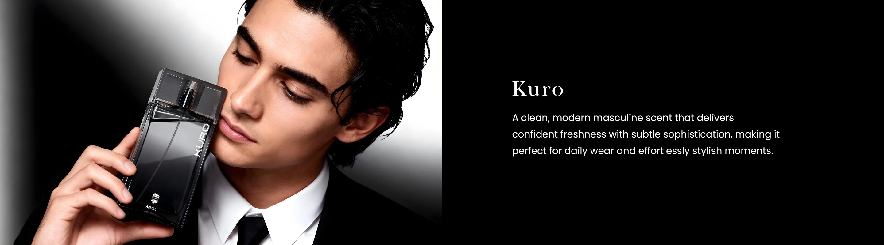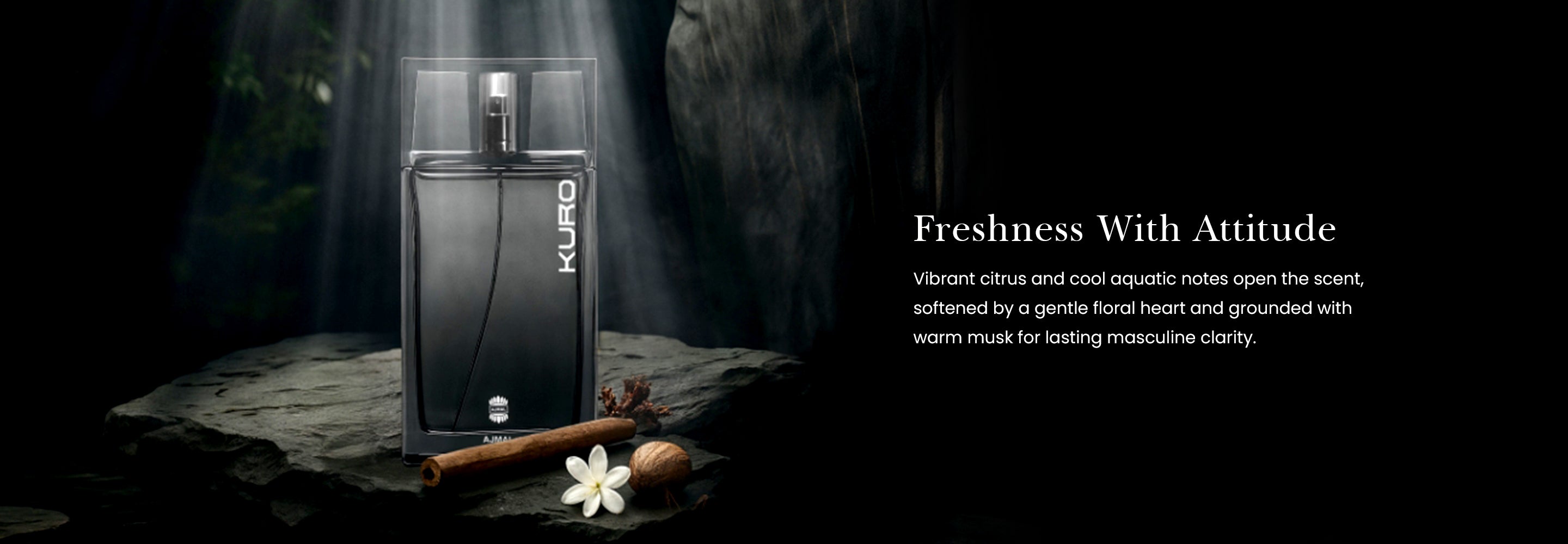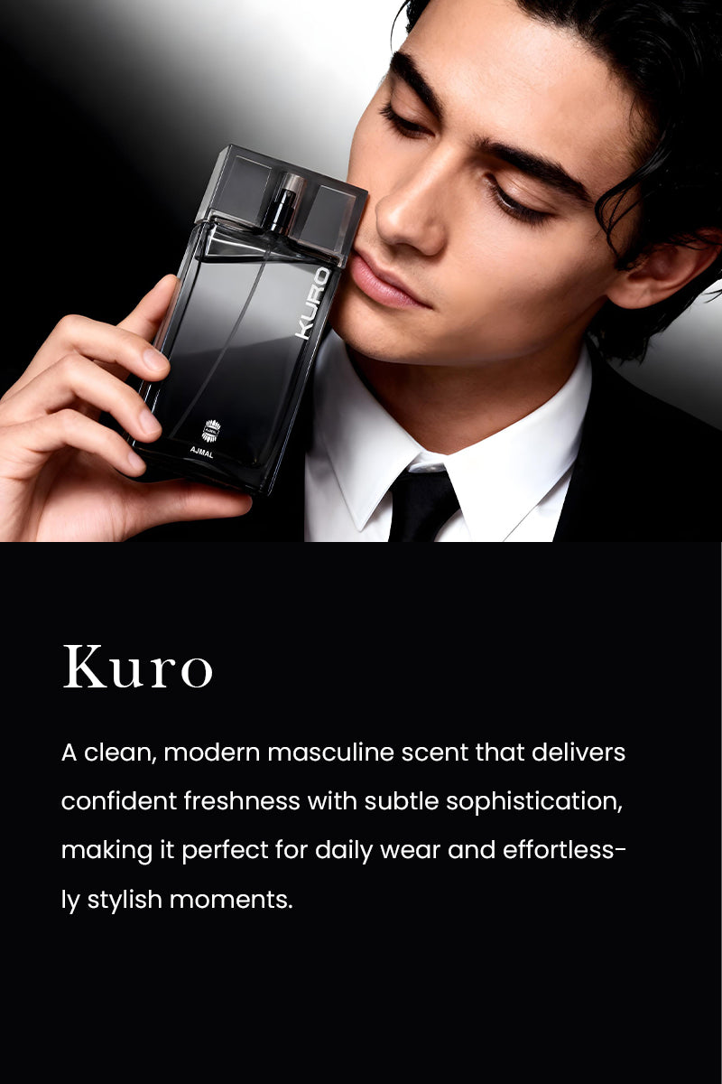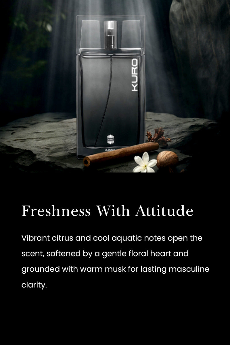 - Ajmal Kuro Perfume is a bold and modern Eau de Parfum crafted for men who command attention with subtle sophistication. This 90 ml fragrance opens with vibrant citrus and aquatic notes, unfolds into a delicate floral heart, and settles into a warm, musky base that stays with you. Perfect as a fresh perfume for men, Kuro blends clarity and character in a scent that’s light yet lasting. Its distinct aqua fresh perfume appeal adds an energetic edge, while the soft floral middle notes give it a smooth, contemporary twist. For those seeking a floral perfume for men that doesn't overpower but makes a confident impression, Kuro Perfume stands out. It’s clean, expressive, and ideal for everyday wear or casual elegance. Dynamic, fresh, and effortlessly stylish - Ajmal Kuro is freshness reimagined.