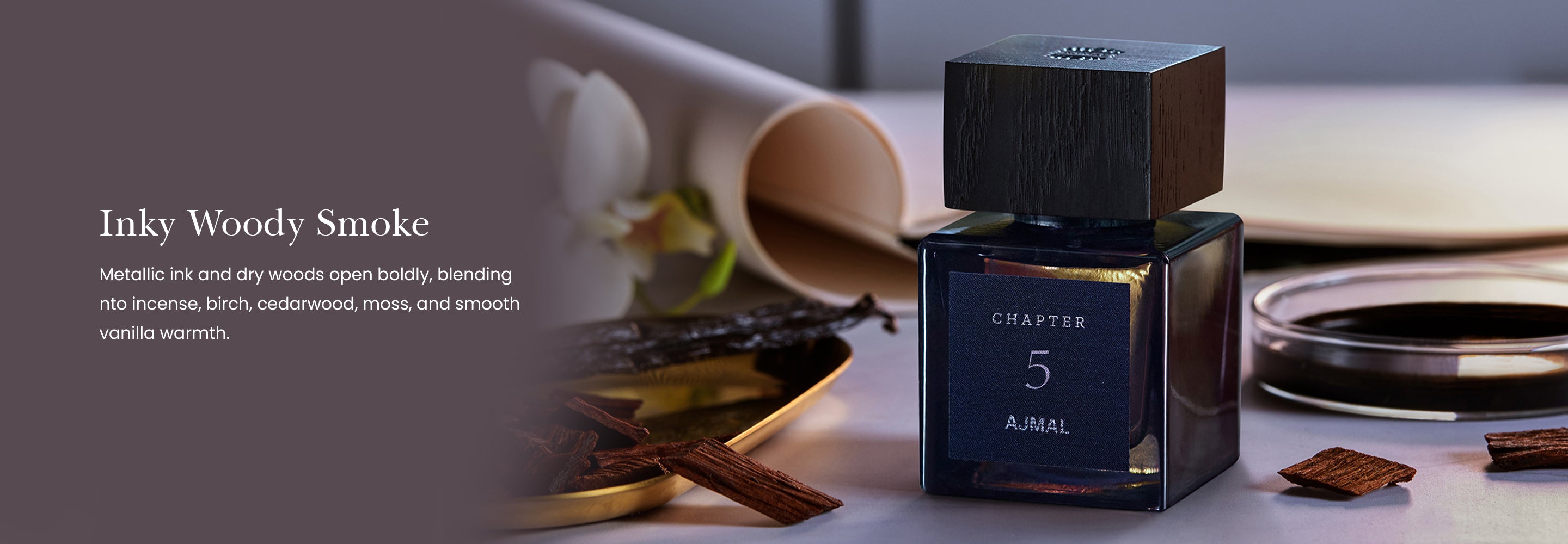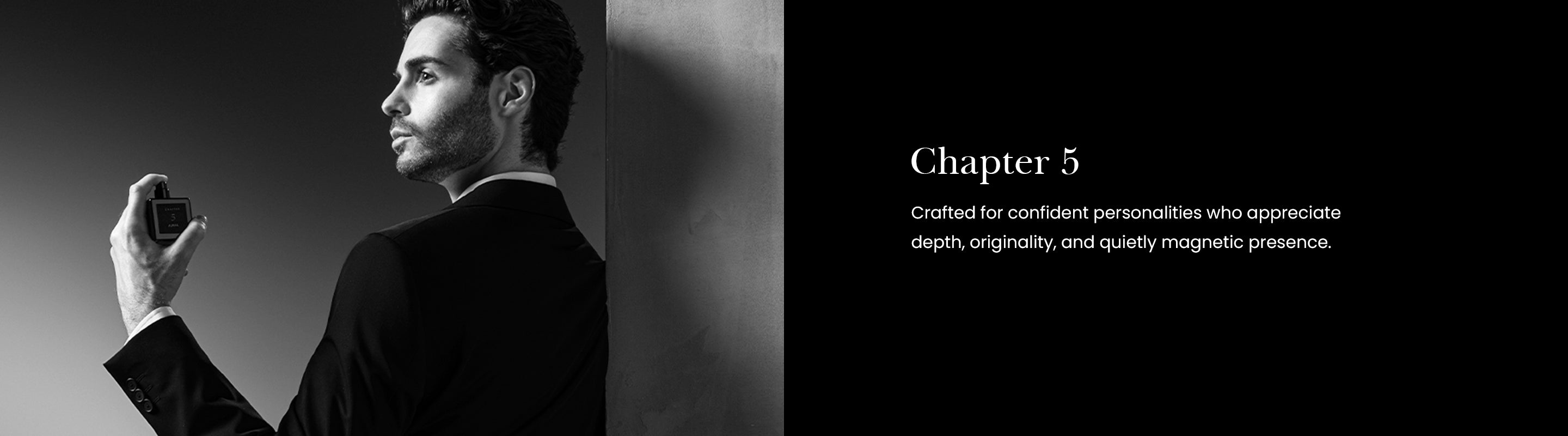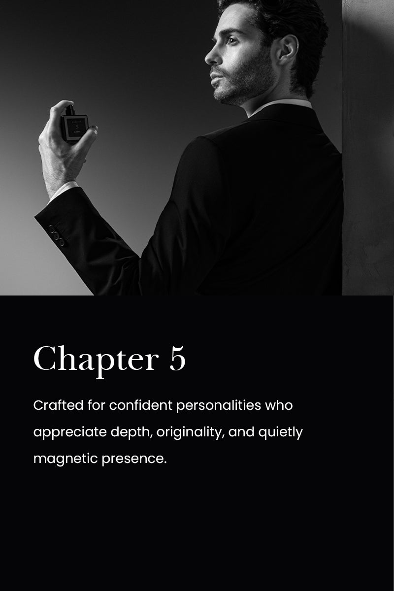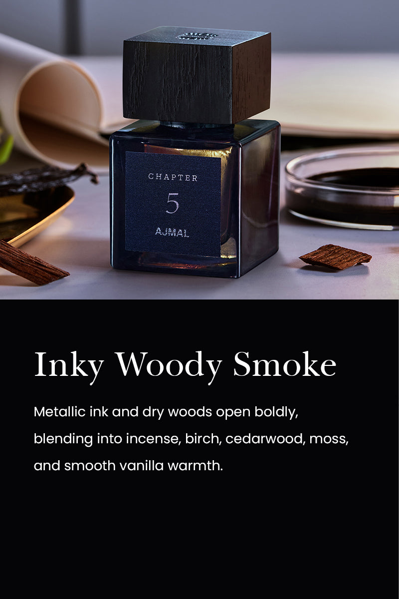 Chapter 5 is an innovative twist on the Fougère Woody family, where bold contrasts come together in perfect harmony. The fragrance opens with the sharp, metallic freshness of dry wood and black ink accord, creating an arresting first impression and setting the tone for the unexpected journey. Incense, santoud, and birch blend in the heart, adding smoky depth and complexity, enveloping the senses in a rich, mysterious aura. These notes create a captivating tension between the primal and the refined, making this fragrance feel ancient and modern. The base reveals a fresh, airy quality through cedarwood and Cristal moss, balanced by vanilla's smooth, dark warmth, which lingers and adds a sophisticated finish. Chapter 5 is a fragrance for those seeking the unconventio#N/Al, evolving scent with every wear, leaving a trail of intrigue and elegance.